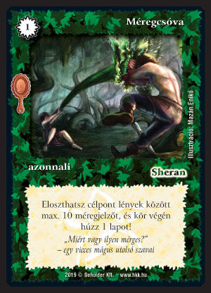 Szöveg: Eloszthatsz célpont lények között max. 10 méregjelzőt, és kör végén húzz 1 lapot!
