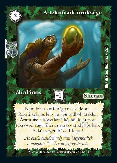 Szöveg: Nem lehet anti-mágiának eldobni. Rakj 2 teknős lényt a gyűjtődből játékba! Áramlás: a következő kézből kijátszott teknősöd vagy Sheran varázslatod [[2]]-t kap, és kör végén húzz 1 lapot!