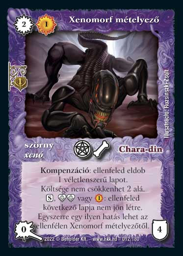 Szöveg: Kompenzáció: ellenfeled eldob 1 véletlenszerű lapot. Költsége nem csökkenhet 2 alá. (S), _etnikum_etnikum vagy (1): ellenfeled következő lapja nem jön létre. Egyszerre egy ilyen hatás lehet az ellenfélen Xenomorf mételyezőtől.