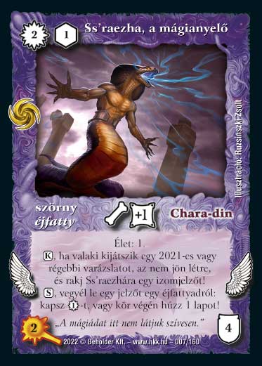 Szöveg: Élet: 1. (K), ha valaki kijátszik egy 2021-es vagy régebbi varázslatot, az nem jön létre, és rakj Ss'raezhára egy izomjelzőt! (S), vegyél le egy jelzőt egy éjfattyadról: kapsz 1_VP-t, vagy kör végén húzz 1 lapot!